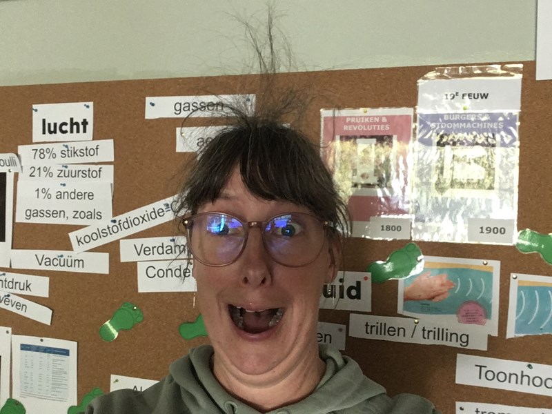 Oren gespitst, ogen open, goed wrijven met de ballon en..... De meest wonderlijke dingen gebeurden er! Blikjes rolden als vanzelf door de klas; zout vloog omhoog; ballonnen plakten aan het plafond en onze haren ....... tja, die waren ook zeer statisch!
