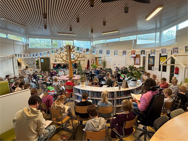 Vandaag was het tijd voor onze leesslinger met alle kinderen van school. Wat is het toch mooi om te zien dat iedereen geconcentreerd in zijn / haar boek aan het lezen is!